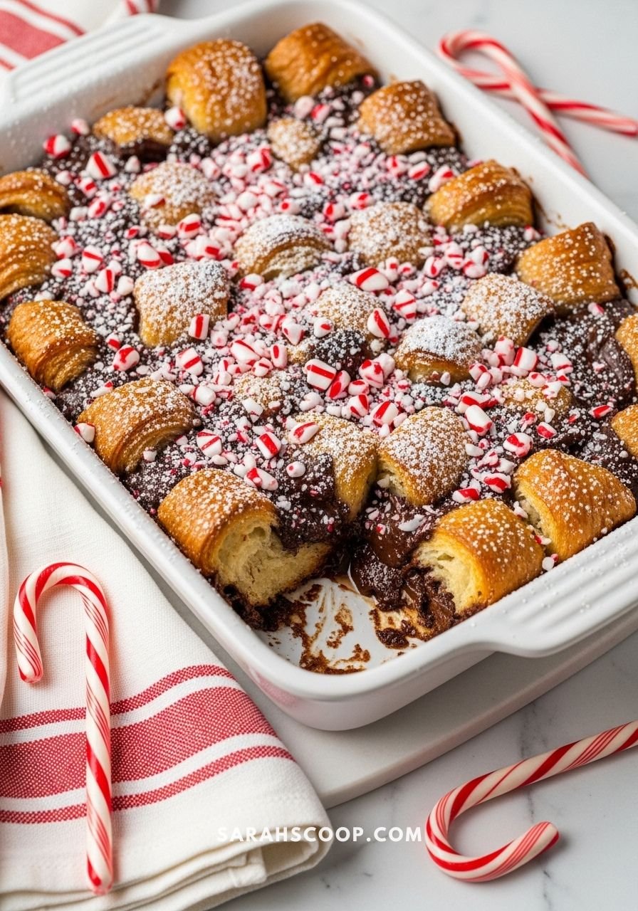 This peppermint chocolate croissant casserole tastes like a bakery pastry in casserole form. It’s rich, festive, and a fun dessert or Christmas morning treat to round out your easy Christmas casserole recipes.