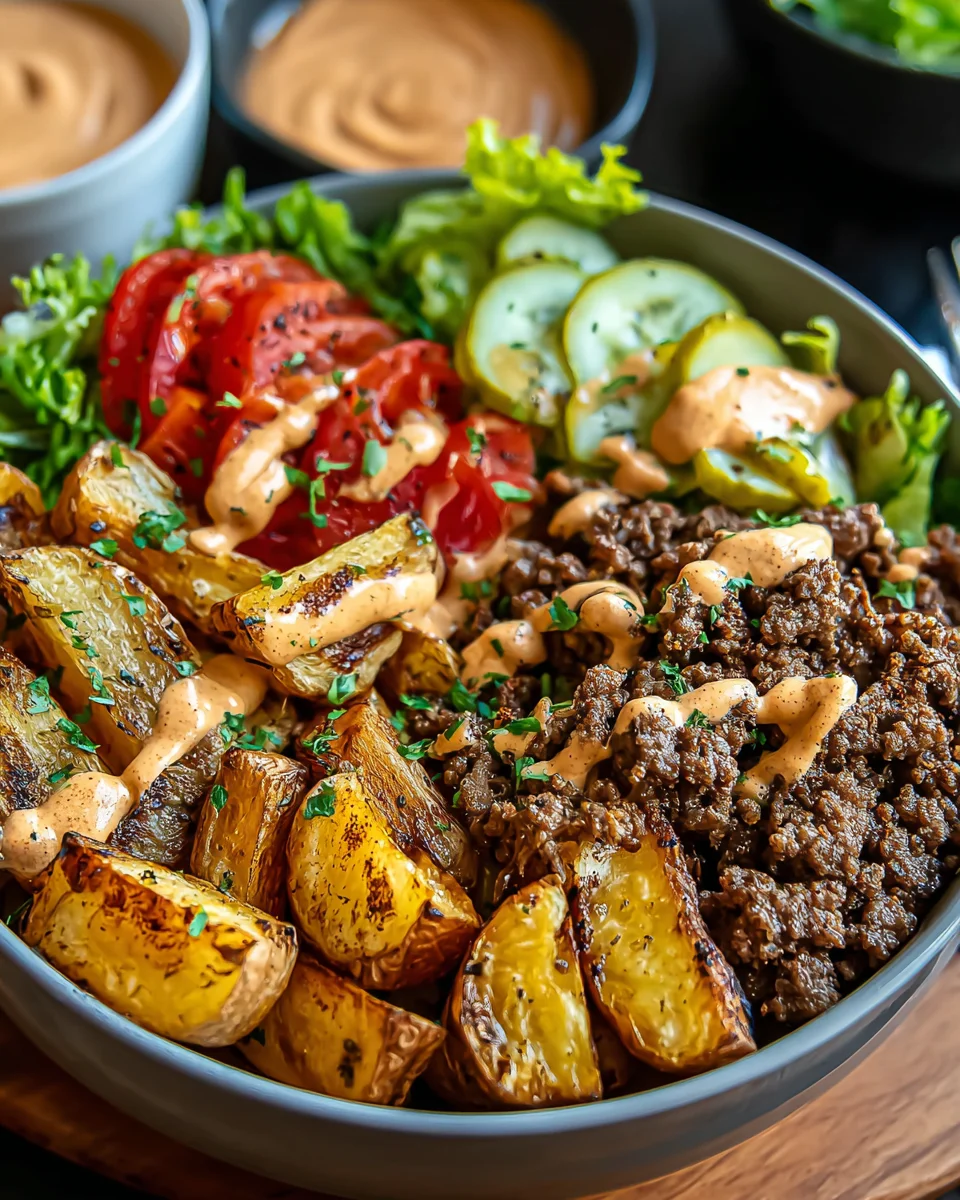 Now for the fun part—assembly! Start with a layer of crispy chips in each bowl. Next, add a generous handful of shredded lettuce. Pile on the cooked beef, and don’t be shy with the cheese and pickle slices. Finally, drizzle your delicious burger sauce over the top. Voilà! Your Bold Burger Bowls are ready to impress!